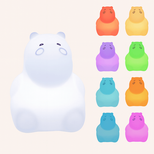 - Veilleuse LED hippopotame rechargeable : autonomie confortable, intensité réglable et, selon le modèle, éclairage multicolore pour créer des ambiances douces ou ludiques.